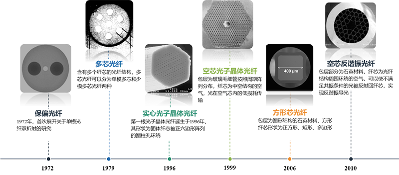 光纤在使用过程中必然受到外部应力作用,使光纤表现出一定程度的偏振模色散,1972年F.P.KAPRON首次开展单模光纤双折射的研究,研究表明单模光纤的双折射特性和信息传输与光纤长度相关,为此,能够维持光波偏振态,减少偏振色散的保偏光纤(例如熊猫型保偏光纤)在20世纪80年代被广泛研究应用。图4 为特种光纤的结构发展历程。