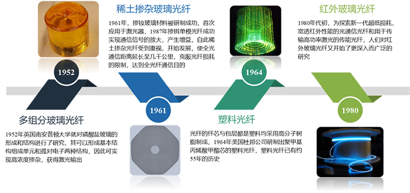 1952年英国南安普顿大学就对磷酸盐玻璃的形成和结构进行了研究,磷酸盐玻璃可以形成基本结构组成单元和孤对电子两种结构,因此可实现高浓度稀土掺杂,获得激光输出,该类光纤主要用作短距离的信号传输和图像传输,且由于不同比例的材料成分制作出来的玻璃光学性质不同,使得多组分玻璃的种类繁多,制造成本也比较低。目前主要的种类有:重金属氧化物玻璃,氟化物玻璃、硫化物玻璃、碲酸盐玻璃以及“肖特”体系玻璃等。图5为特种光纤材料的发展历程。