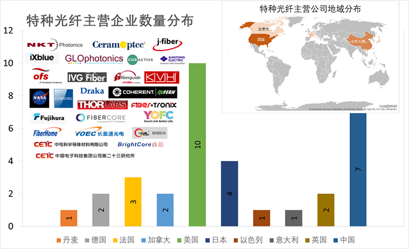 特种光纤发展的60年里,每一种光纤都有自己的发展周期,都在经历从进口到国产化的过程。如今全球主营的特纤公司达到50余家(如图8),主要集中在欧洲、美洲、亚洲地区,欧洲主营的公司有丹麦的NKT Photonics,德国J-fiber,法国GLO Photonics,英国Fiber Core等;美洲主营的公司有美国Corning、OFS、Nufern,加拿大Coractive、IVG Fiber等;亚洲主营公司主要集中在中国的长飞、烽火、凯发k8国际和日本的Sumitomo、Hitachi等。